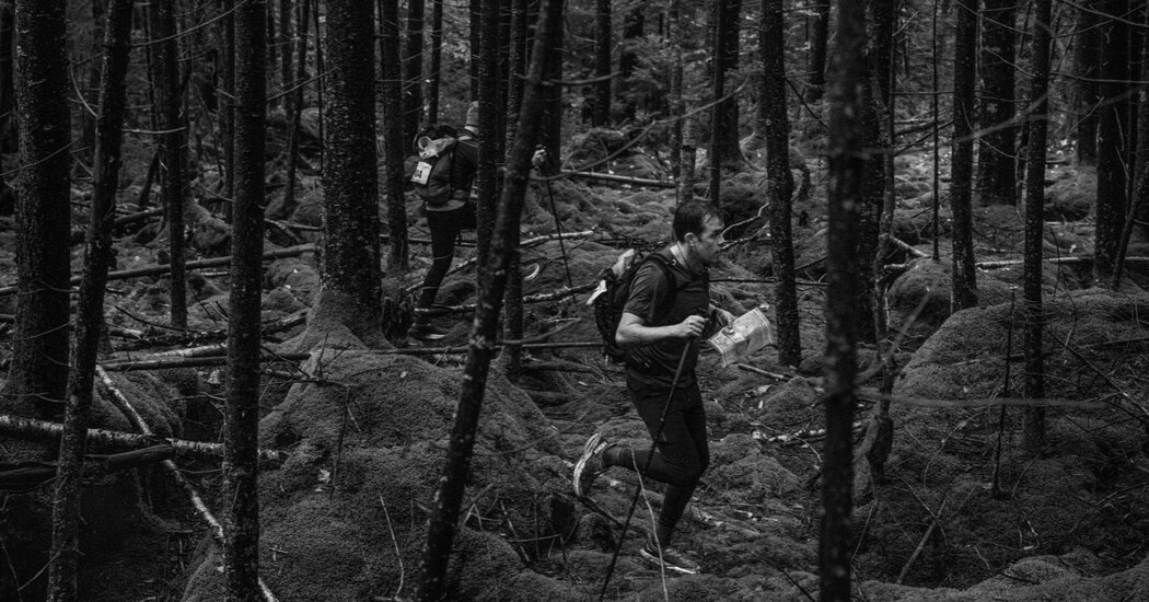 The find provided some much-needed encouragement, especially as storm bursts had started to infiltrate our rain jackets. Next, we followed our compasses through a pine barren deeply carpeted in moss, which felt like walking on green clouds, and then boulder-hopped across an ancient glacial moraine, quickly locating two checkpoints. With each find, our hearts rose. Our searches became more efficient, too, as we coordinated more seamlessly. Feeling confident, we took a navigational gamble, cutting across the upper slopes of a thickly wooded mountain and ignoring a circuitous gravel road below. As we spiked the next checkpoint, we whooped at our success. I couldn’t help smiling as we soon crossed paths with a team we had leapfrogged, which took the easier but longer way and was still searching for the checkpoint.