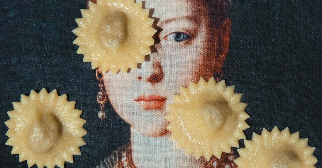 His grandmother Pierina Fogliati, born at the turn of the 20th century in the nearby village of Costigliole d’Asti to the contadini, or peasant class, learned to make agnolotti del plin at home and when she was called upon as an extra hand in the kitchens of a wealthy family. The recipe she passed down to her children has much in common with the one in the cookbook “La Cucina Sana, Economica ed Elegante Secondo le Stagioni” (“Healthy, Economical and Elegant Cuisine According to the Seasons”), published in 1846 by Francesco Chapusot, the chef to the English ambassador in Turin. Chapusot instructs the home cook to roll the dough (made of flour, fresh butter, milk and eggs) into a very thin, wide sheet and paint it, using a feather brush, with a beaten egg. Then, he writes, place hazelnut-size bits of filling about an inch apart across the entire sheet, lay another sheet of dough on top, pinch the dough around the filling to make little mounds and slice around the mounds to create many small packets the width of a half-scudo (an Italian coin discontinued in the 19th century). For the filling, Chapusot advises a blend of “fatty meats,” nutmeg, Parmesan, egg, cream, parsley, garlic, salt and pepper. Fogliati’s recipe calls for escarole, as well, and a combination of veal, pork and rabbit. She served hers with a meaty ragù or a simple butter sauce. Others add the agnolotti to a broth.